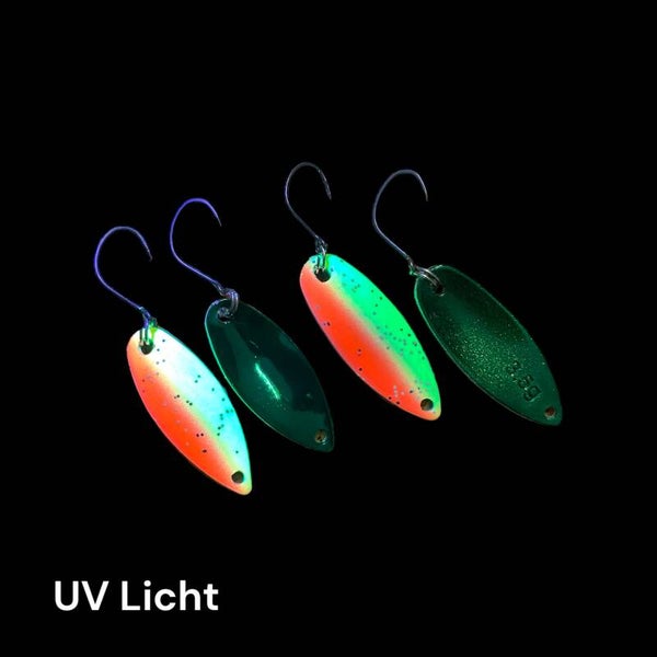 Der Scarlett Spoon ist ein schmal-oval länglich gestalteter Forellenbllinker, welcher leicht gewölbt ist. Durch diese Form eignet er sich für das monotone Steady-Retrieve in stillen oder moderat fließenden, nicht zu flachen Gewässern. Den Scarlett gibt es in drei Gewichtsklassen 2,2g /2,8g und 3,5g Die exzellent ausgearbeitete Gewichtsverteilung bewirkt ein extrem windstabiles Flugverhalten und zielgenaues Spotten. Somit könnt ihr mit ihm viele Situationen am Gewässer abdecken. Ausgestattet ist der Scarlett mit einem hochwertigem Einzelhaken. Diese Spoons werden per Hand lackiert.